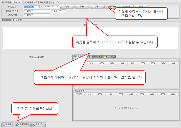 각 연령별로 센터별 수당발생금액 집계내역을 조회합니다. |