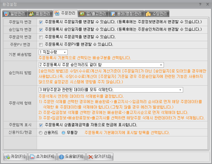 환경설정 메뉴에서 소비자+주문과 관련하여 다음과 같은 항목들이 있습니다. |